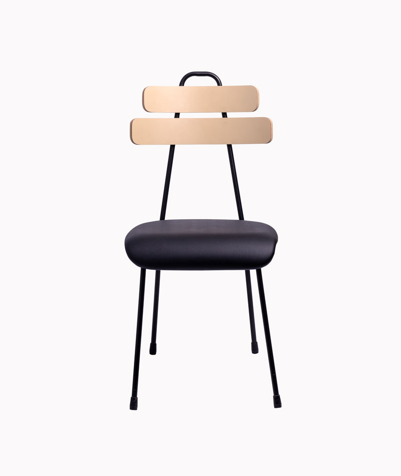 Assento estofado revestido em couro sintético e encosto em madeira laminada prensada revestida com laminado melamínico.